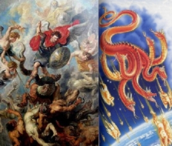 Apo.12:7 Se libró entonces una gran batalla en el cielo. Miguel y los ángeles que están bajo su mando pelearon contra el dragón y sus huestes de ángeles. 8 Estos últimos, una vez vencidos, fueron expulsados del cielo. 9 ¡Aquel gran dragón, que no es otro sino la serpiente antigua que se llama diablo o Satanás, y engaña a todo el mundo, fue arrojado a la tierra junto con la totalidad de su ejército!
