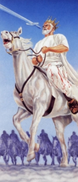 Ahora Juan ve desde el cielo un caballo blanco. El jinete libra una guerra justa. Está vestido con una túnica manchada de sangre, y su nombre es Palabra de Dios. Ejércitos lo siguen vestidos de blanco.