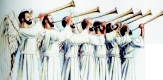 En el capítulo ocho, Jesús abre el séptimo sello. Se reparten siete trompetas y, al sonar las cuatro primeras, cae fuego mezclado con sangre y más estrellas caen del cielo, la luna y el sol pierden un tercio de su luz. Los cielos se estremecen.