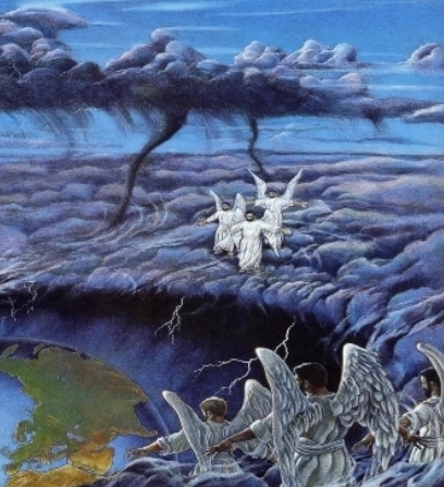 Apo.7:1 Entonces vi a cuatro ángeles que, parados en las cuatro esquinas de la tierra, detenían los cuatro vientos para que estos no se desataran sobre la tierra, el mar y los árboles.