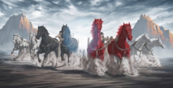 Tenemos casi la misma imagen que en los jinetes apocalípticos del capítulo seis del Apocalipsis, es decir, un caballo blanco, uno rojo, uno negro y uno manchado, que equivale a un caballo pálido. Quiénes son estos caballos lo explica un ángel en Zacarías, capítulo 6:4-5.